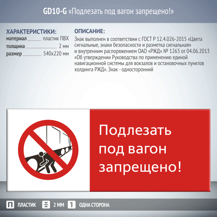 Знак «Подлезать под вагон запрещено!», GD10-G (односторонний горизонтальный, 540х220 мм, пластик 2 мм) в Пушкино купить