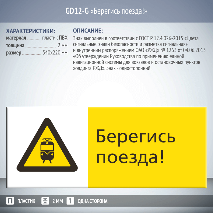 Знак «Берегись поезда!», GD12-G (односторонний горизонтальный, 540х220 мм, пластик 2 мм) в Пушкино купить