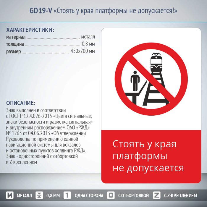 Знак «Стоять у края платформы не допускается!», GD19-V (односторонний вертикальный, 450х700 мм, металл, с отбортовкой и Z-креплением) в Пушкино купить
