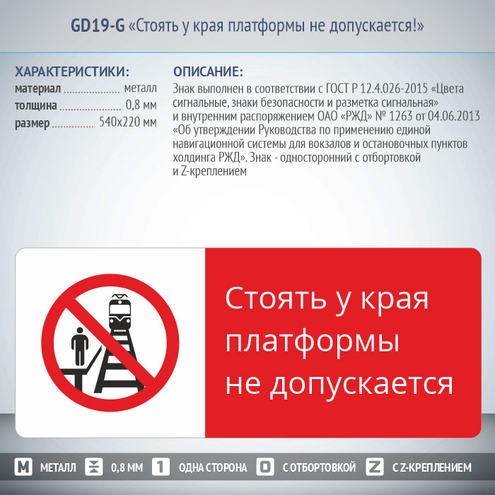Знак «Стоять у края платформы не допускается!», GD19-G (односторонний горизонтальный, 540х220 мм, металл, с отбортовкой и Z-креплением) в Пушкино купить