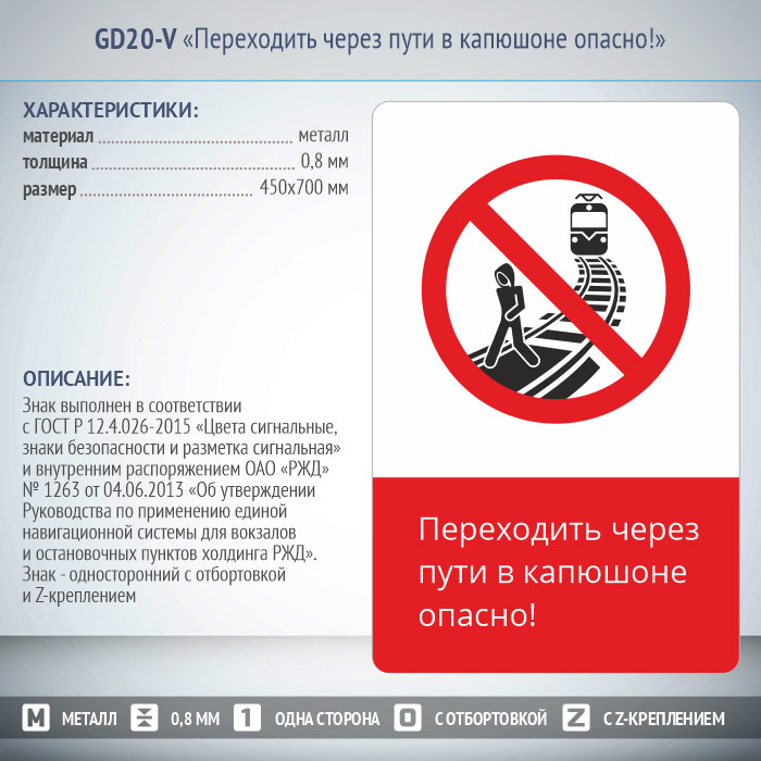 Знак «Переходить через пути в капюшоне опасно!», GD20-V (односторонний вертикальный, 450х700 мм, металл, с отбортовкой и Z-креплением) в Пушкино купить