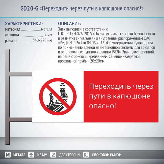 Знак «Переходить через пути в капюшоне опасно!», GD20-G (двусторонний горизонтальный, 540х220 мм, металл, на раме с боковым креплением) в Пушкино купить