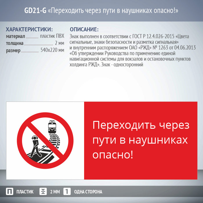Знак «Переходить через пути в наушниках опасно!», GD21-G (односторонний горизонтальный, 540х220 мм, пластик 2 мм) в Пушкино купить