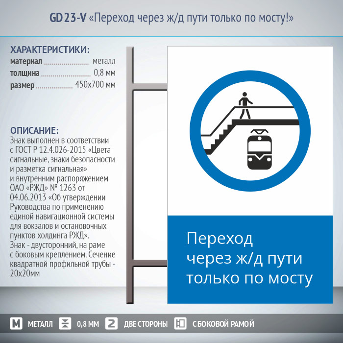 Знак «Переход через ж/д пути только по мосту!», GD23-V (двусторонний вертикальный, 450х700 мм, металл, на раме с боковым креплением) в Пушкино купить