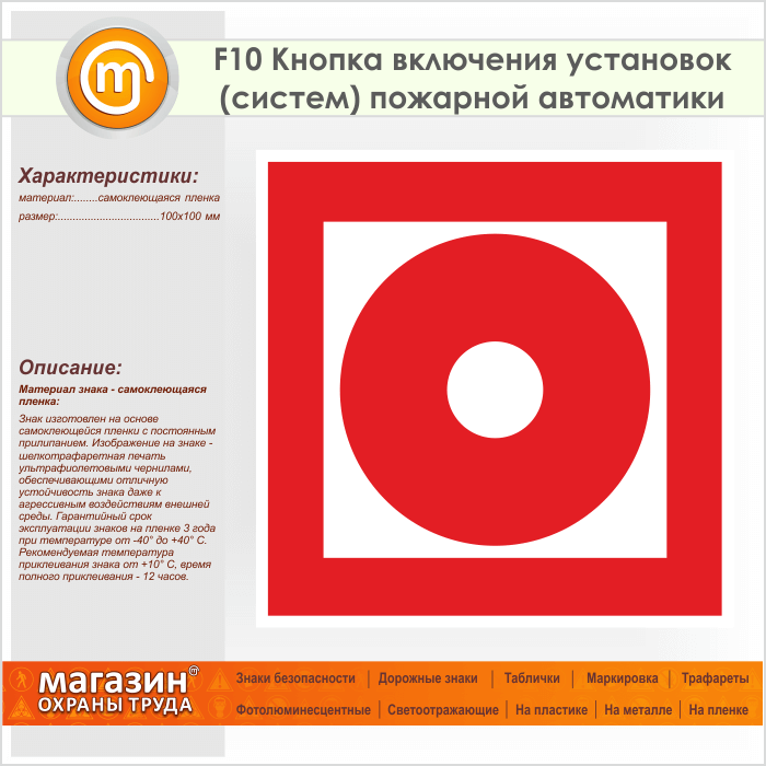 Знак F10 «Кнопка включения установок (систем) пожарной автоматики» (пленка, 100х100 мм) в Пушкино купить