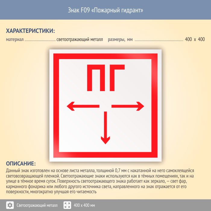 Знак F09 «Пожарный гидрант» (светоотражающий металл, 400х400 мм) в Пушкино купить