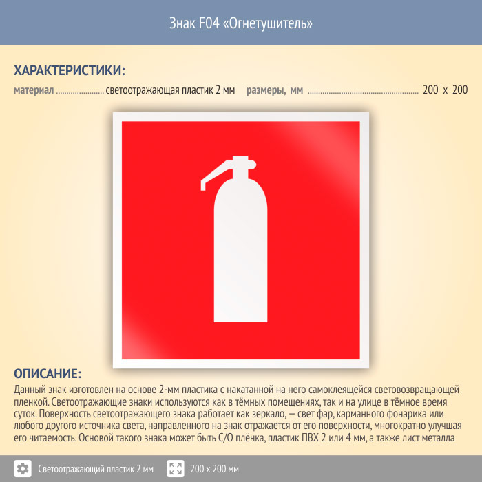 Знак F04 «Огнетушитель» (светоотражающий пластик, 200х200 мм) в Пушкино купить