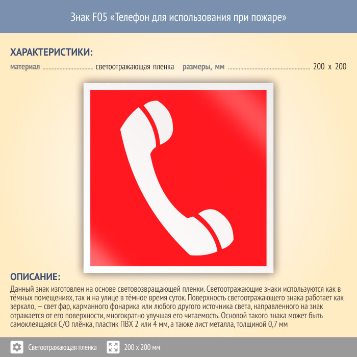 Знак F05 «Телефон для использования при пожаре (в том числе телефон прямой связи с пожарной охраной)» (светоотражающая пленка, 200х200 мм) в Пушкино купить