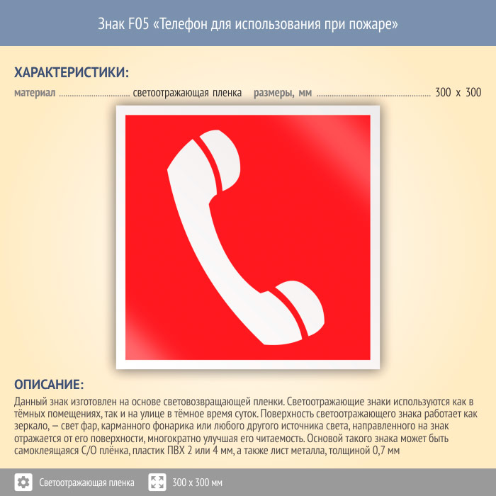 Знак F05 «Телефон для использования при пожаре (в том числе телефон прямой связи с пожарной охраной)» (светоотражающая пленка, 300х300 мм) в Пушкино купить