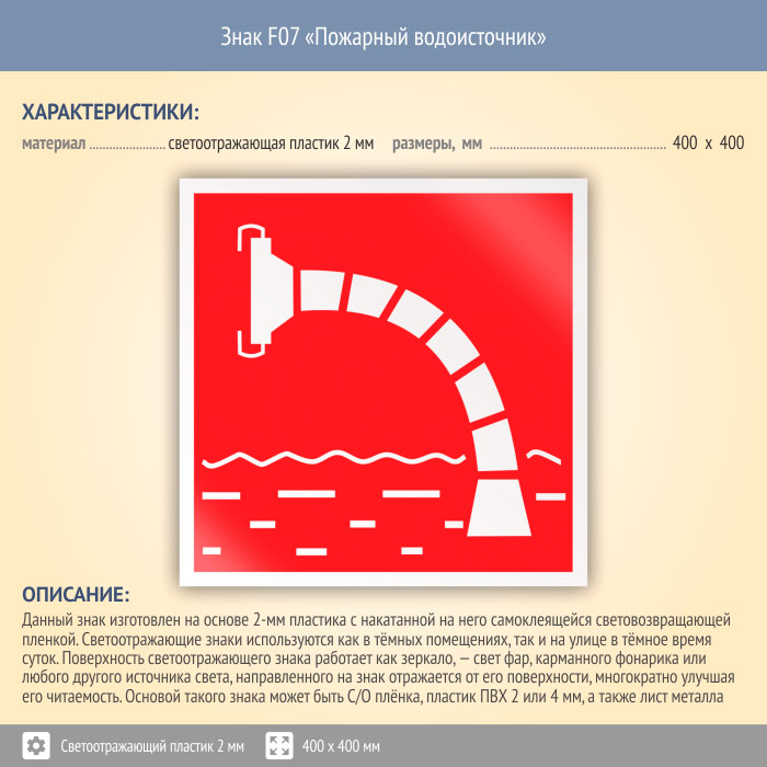 Знак F07 «Пожарный водоисточник» (светоотражающий пластик, 400х400 мм) в Пушкино купить
