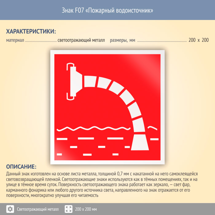 Знак F07 «Пожарный водоисточник» (светоотражающий металл, 200х200 мм) в Пушкино купить