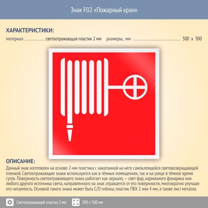 Знак F02 «Пожарный кран» (светоотражающий пластик, 300х300 мм) в Пушкино купить