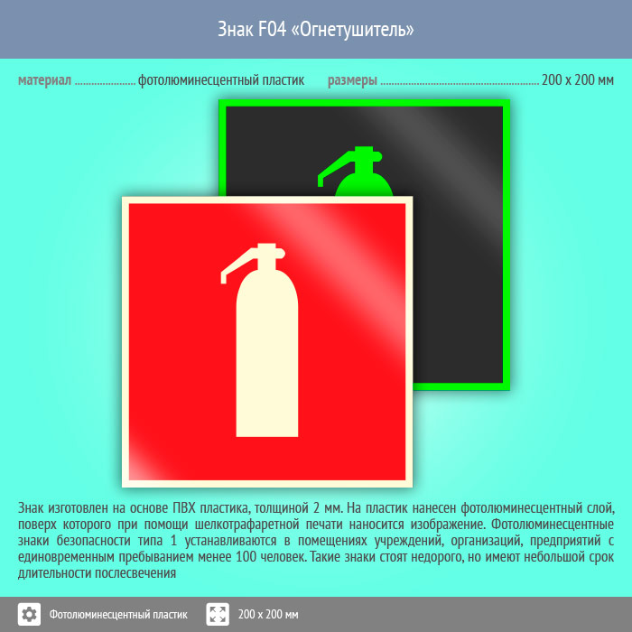 Знак F04 «Огнетушитель» (фотолюминесцентный пластик, 200х200 мм) в Пушкино купить