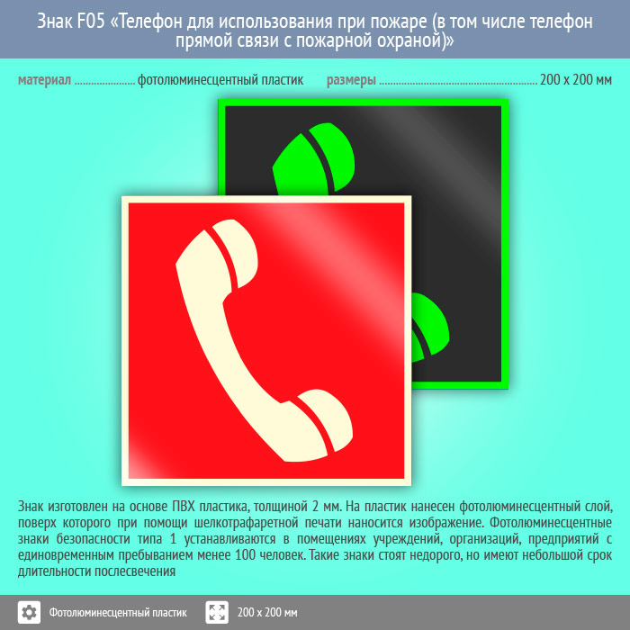 Знак F05 «Телефон для использования при пожаре (в том числе телефон прямой связи с пожарной охраной)» (фотолюминесцентный пластик, 200х200 мм) в Пушкино купить
