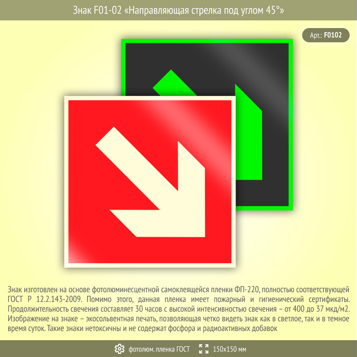Знак F01-02 «Направляющая стрелка под углом 45°» (фотолюминесцентная пленка ГОСТ 34428-2018, 150х150 мм) в Пушкино купить