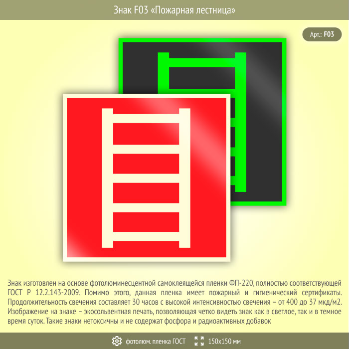 Знак F03 «Пожарная лестница» (фотолюминесцентная пленка ГОСТ 34428-2018, 150х150 мм) в Пушкино купить