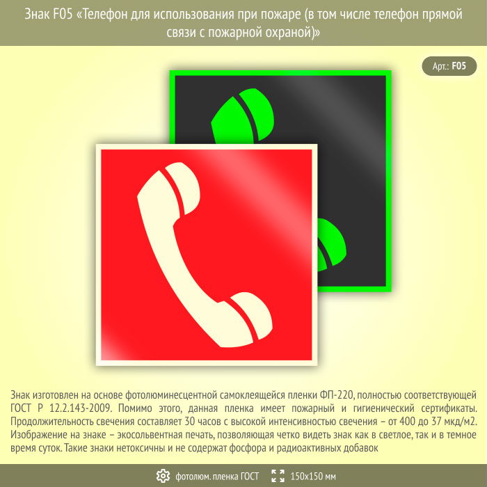 Знак F05 «Телефон для использования при пожаре (в том числе телефон прямой связи с пожарной охраной)» (фотолюминесцентная пленка ГОСТ 34428-2018, 150х150 мм) в Пушкино купить