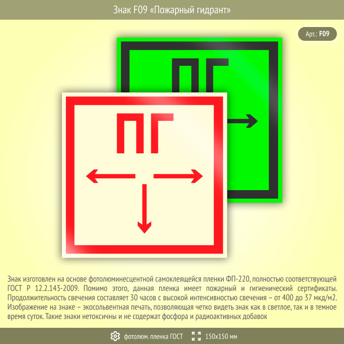 Знак F09 «Пожарный гидрант» (фотолюминесцентная пленка ГОСТ 34428-2018, 150х150 мм) в Пушкино купить
