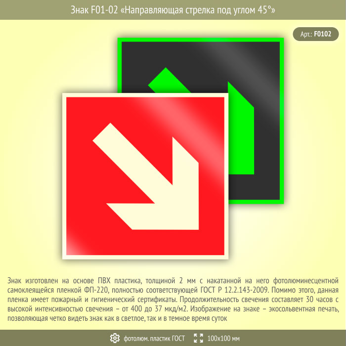 Знак F01-02 «Направляющая стрелка под углом 45°» (фотолюминесцентный пластик ГОСТ 34428-2018, 100х100 мм) в Пушкино купить