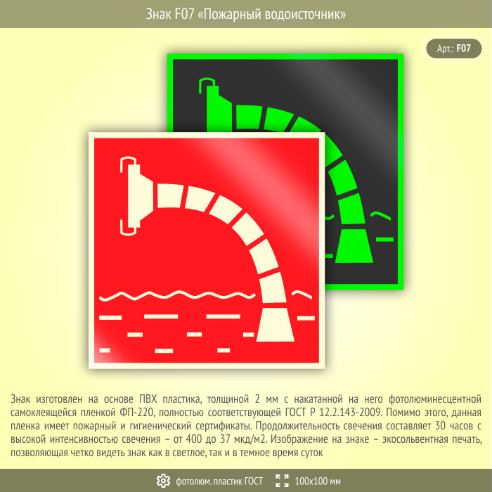 Знак F07 «Пожарный водоисточник» (фотолюминесцентный пластик ГОСТ 34428-2018, 100х100 мм) в Пушкино купить