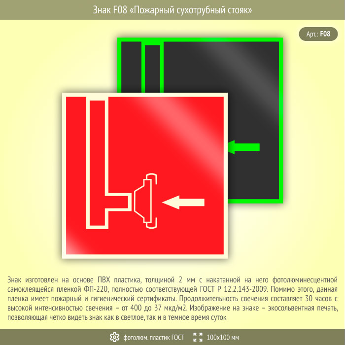 Знак F08 «Пожарный сухотрубный стояк» (фотолюминесцентный пластик ГОСТ 34428-2018, 100х100 мм) в Пушкино купить