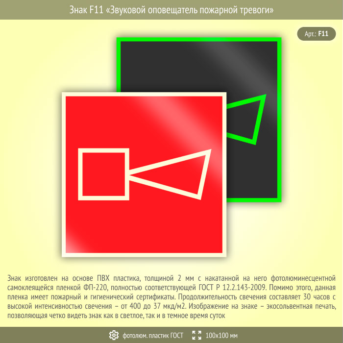 Знак F11 «Звуковой оповещатель пожарной тревоги» (фотолюминесцентный пластик ГОСТ 34428-2018, 100х100 мм) в Пушкино купить