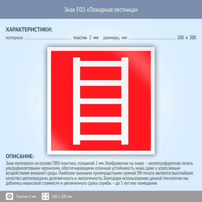 Знак F03 «Пожарная лестница» (пластик, 200х200 мм) в Пушкино купить
