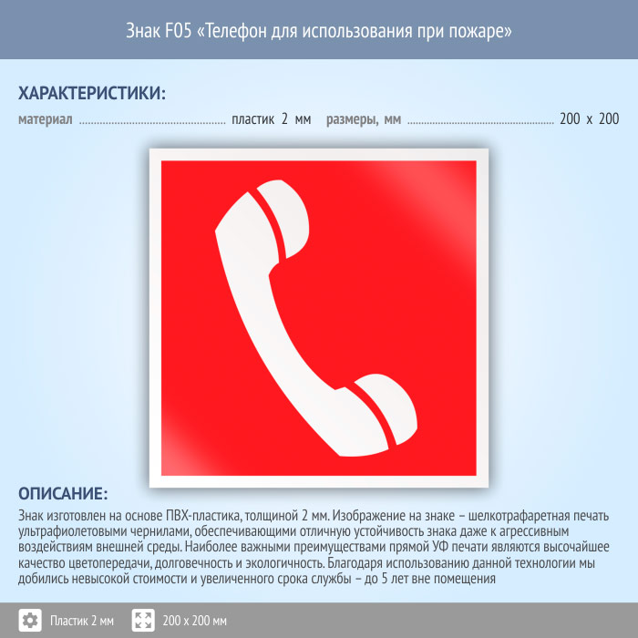 Знак F05 «Телефон для использования при пожаре (в том числе телефон прямой связи с пожарной охраной)» (пластик, 200х200 мм) в Пушкино купить