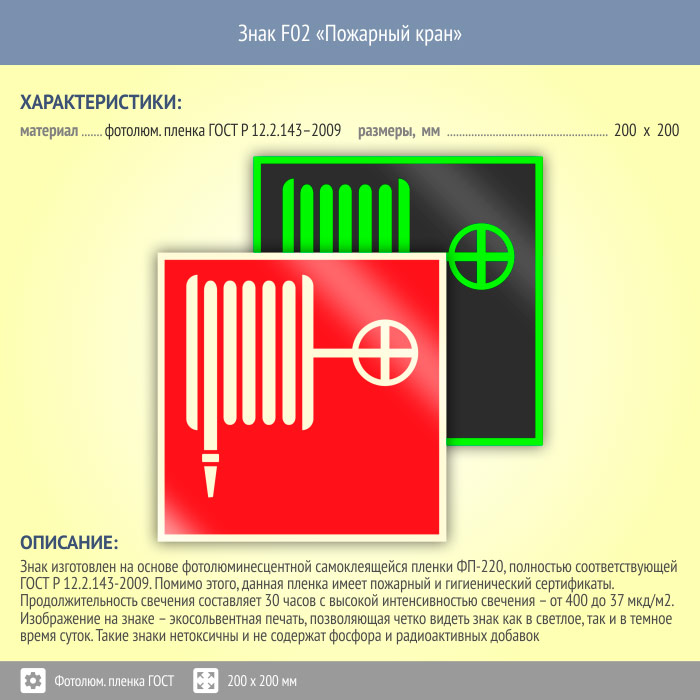 Знак F02 «Пожарный кран» (фотолюминесцентная пленка ГОСТ 34428-2018, 200х200 мм) в Пушкино купить