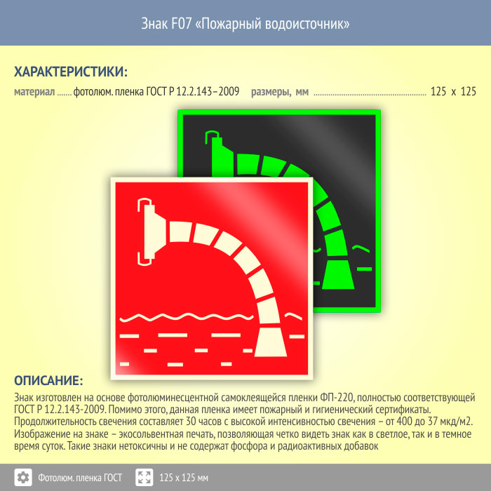 Знак F07 «Пожарный водоисточник» (фотолюминесцентная пленка ГОСТ 34428-2018, 125х125 мм) в Пушкино купить
