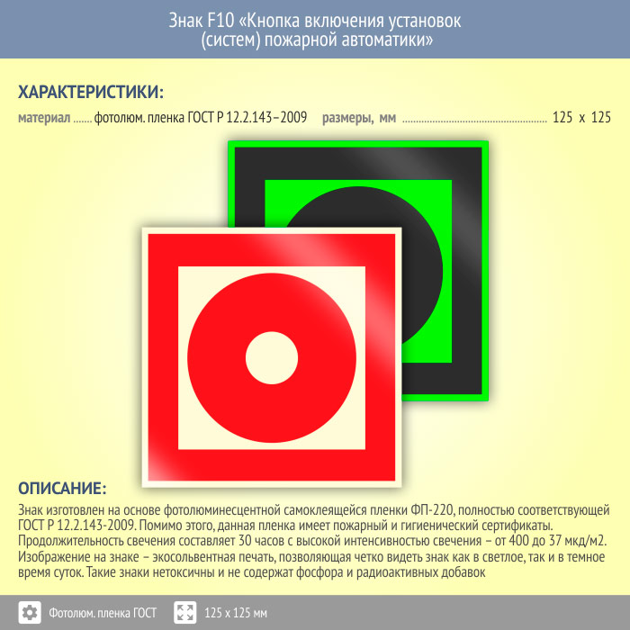 Знак F10 «Кнопка включения установок (систем) пожарной автоматики» (фотолюминесцентная пленка ГОСТ 34428-2018, 125х125 мм) в Пушкино купить
