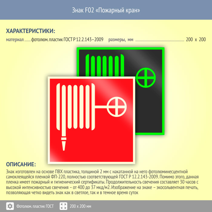 Знак F02 «Пожарный кран» (фотолюминесцентный пластик ГОСТ 34428-2018, 200х200 мм) в Пушкино купить