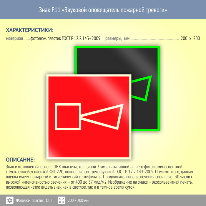 Знак F11 «Звуковой оповещатель пожарной тревоги» (фотолюминесцентный пластик ГОСТ 34428-2018, 200х200 мм) в Пушкино купить