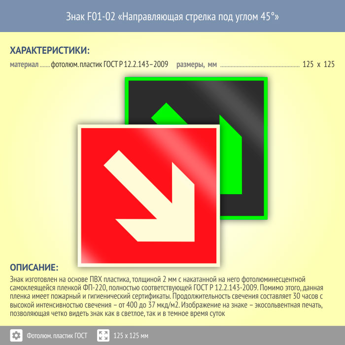 Знак F01-02 «Направляющая стрелка под углом 45°» (фотолюминесцентный пластик ГОСТ 34428-2018, 125х125 мм) в Пушкино купить