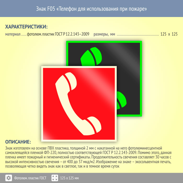 Знак F05 «Телефон для использования при пожаре (в том числе телефон прямой связи с пожарной охраной)» (фотолюминесцентный пластик ГОСТ 34428-2018, 125х125 мм) в Пушкино купить