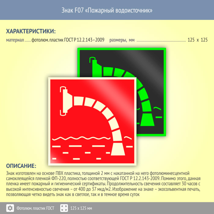 Знак F07 «Пожарный водоисточник» (фотолюминесцентный пластик ГОСТ 34428-2018, 125х125 мм) в Пушкино купить