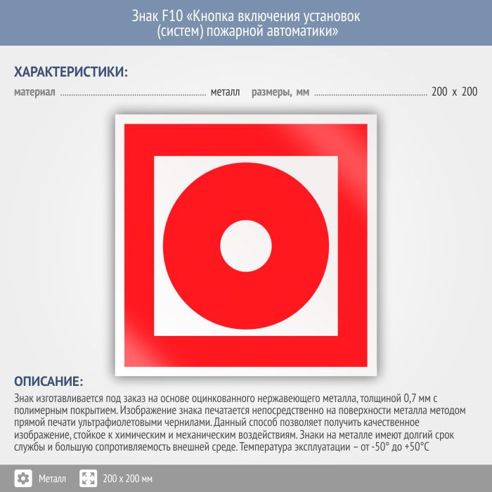 Знак F10 «Кнопка включения установок (систем) пожарной автоматики» (металл, 200х200 мм) в Пушкино купить